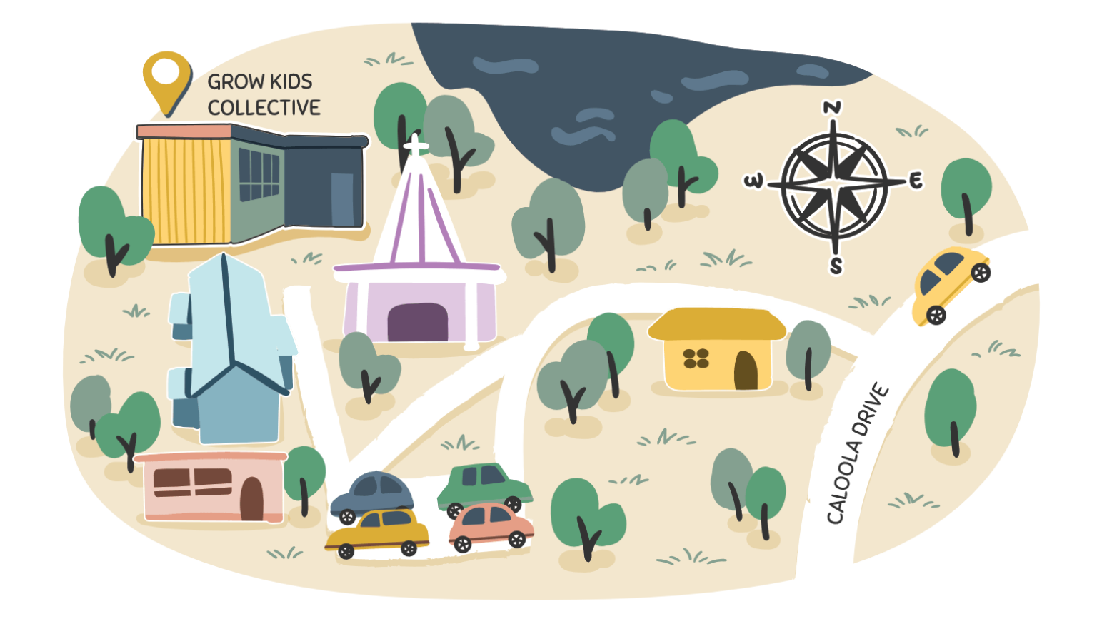 We are a little bit tucked away.. Enter the driveway from Caloola Drive. Follow the driveway as it takes you around the main building then to the right as you drive between the two main blocks you will see Grow Kids Collective, a stand alone building at the end of the road. Park you car and come on in.